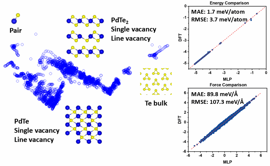 在本工作中,高峻峰教授和常远博士后发展了包含Pd、Te单质以及含缺陷的PdTe2和PdTe等多种小尺度模型,采用密度泛函理论(DFT)计算,生成了约21.8万组结构‑能量‑力的数据集(图1)。基于此数据集训练得到的机器学习力场,在保持与DFT相当精度的同时,实现大尺度、长时间的模拟,采用机器学习力场,揭示了PdTe2到PdTe热相变的关键动力学机理。