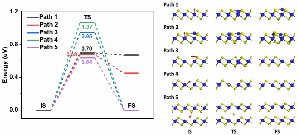 图3. PdTe2中Pd原子和Te空位的扩散路径和势垒