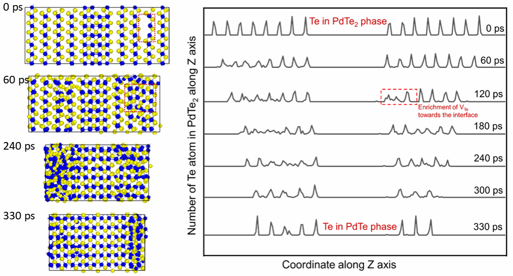 图2. PdTe2到PdTe的连续相变模拟和Te缺陷向PdTe2/PdTe界面的聚集