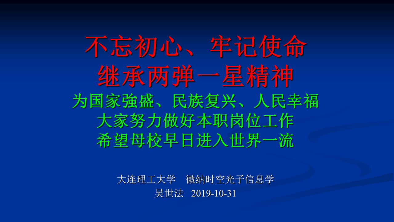 为进一步落实学校及学院“不忘初心、牢记使命”主题教育方案,丰富学习形式,积极开展革命传统教育、先进典型教育,突出“以身边榜样教育身边党员、以身边事感染身边人”,问鼎网中国邀请到我国第一颗原子弹研制工作主要参加者、学院退休教师吴世法教授,于10月31日下午在材料馆201党建智慧教室开展《继承“两弹一星”精神 不忘初心、牢记使命》集中党课活动。
