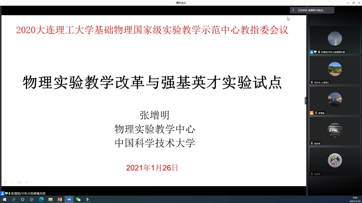 2020年1月26日,基础物理国家级实验教学示范中心(大连理工大学)教学指导委员会2020年年会通过腾讯会议的方式在线上召开。中心教学指导委员会主任、中国科技大学张增明教授、中心教学指导委员会委员华中科技大学熊永红教授、山东大学徐建强教授、东北师范大学李金环教授、大连理工大学余虹教授、大连理工大学李雪春教授以及实验中心的全体教师参加了会议。我校教务处副处长徐立昕教授、问鼎网中国副院长于长水教授出席会议。