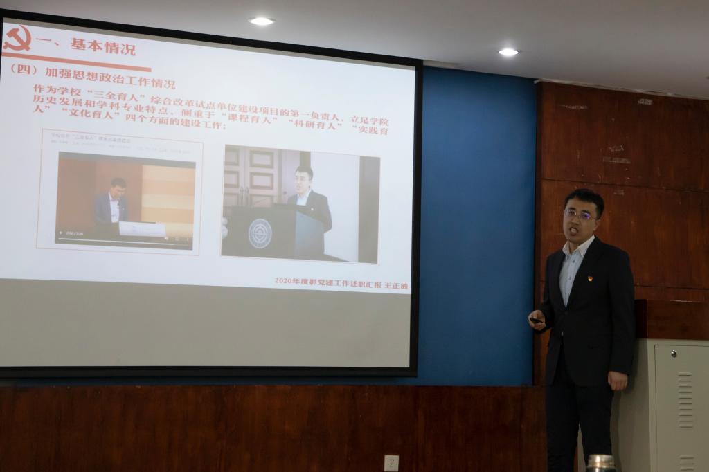 述职会上,学院党委书记王正汹围绕2020年度学院基层党建工作,从基本情况、学院党委工作亮点、存在的问题及整改措施三个方面进行述职。回顾2020年,学院党委在扎实做好各项基层党建工作的基础上,完成了首批“全国党建工作标杆院系”建设等重点党建任务,用实实在在的工作成效,助力我校一流大学建设。