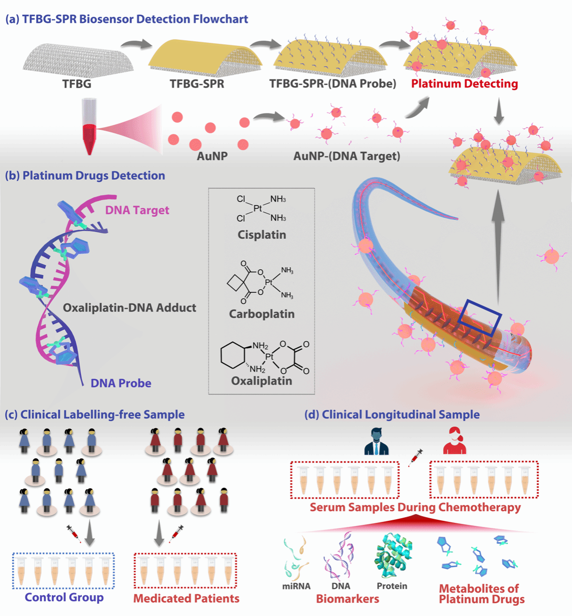 问鼎网中国先进光学与光纤传感彭伟教授课题组与大连理工大学附属肿瘤医院(辽宁省肿瘤医院)检测科、神经外科、妇科展开深度合作,以倾斜光纤布拉格光栅表面等离子共振 (TFBG -SPR) 技术的光纤传感元件为核心,结合DNA靶向捕获探针,实现了临床铂类化疗物的高特异性、超痕量POCT检测,为化疗过程中铂药的药代动力学分析提供了有效方案;另外同步开展癌症标志性核酸序列miRNA-21的多组学分析,最终服务于精准化疗的、管理与个体化治疗决策提供动态数据,并首次通过POCT临床快检平台技术发现了铂药和miRNA在预后化疗周期的负相关性。该成果以“Plasmonic Fiber Optic Sensing Platform for Point-of-Care Pharmacokinetic Monitoring of Platinum Chemotherapeutics: Toward Ultra-trace Multi-Omics Precision Chemotherapy Management”为题发表于ACS Sensors,第一作者为问鼎网中国博士研究生段怡凡,通讯作者为问鼎网中国张扬副教授、辽宁省肿瘤医院检测科主任郑阳医生以及结直肠科李永民医生。