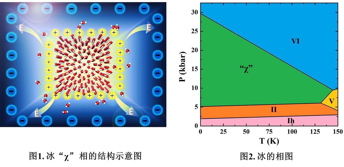 本研究通过系统的第一性原理计算和分子动力学模拟发现:室温下,在高压和高电场强度的条件下,液态水可以自发形成一种高密度(1.27 g/cm3)的新型铁电冰晶体—“冰χ相”(图1)。自由能计算表明,在水相图上的一个高压低温区,冰χ相是最稳定的结构。它位于冰II相和冰VI相之间,与冰V相接邻(图2)。在这个意义上而言,冰χ是一个“被遗漏”的冰相。对此的一个可能解释是:冰χ相的成核/生长需要非常高强度的电场。