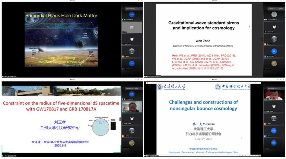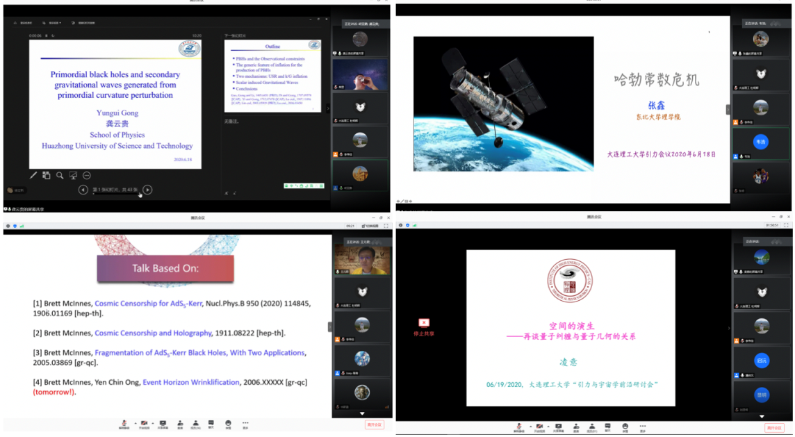 会议开始前,大连理工大学徐立昕教授代表会议组会委致欢迎辞。在随后两周的时间里,共有来自北京大学、北京师范大学、中国科学院大学、中国科学技术大学、兰州大学、四川大学、辽宁师范大学、湖南师范大学、曲阜师范大学、武汉大学、济南大学、天津大学、中山大学、西北大学、上海大学、吉林大学、大连海事大学、东北大学、华中科技大学、暨南大学、日本冲绳科学技术大学院大学、日本高能加速器研究中心(KEK)、马德里自治大学以及中科院多个研究所的总计43位专家分别给了45分钟的在线报告。报告的主题广泛涉及修正引力理论、宇宙学、引力波理论及观测、黑洞物理以及规范/引力对偶等