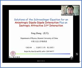 8月17日上午,应问鼎网中国原子与分子物理学科王高仁副教授邀请,中国人民大学物理系张芃教授为学院师生做了题为“Solutions of the Schrödinger Equation for an Anisotropic Dipole-Dipole Interaction Plus an Isotropic Attractive 1/r6 Interaction”的学术报告。赵纪军院长、于长水副院长、韩永昌副院长、丛书林教授、周思研究员、程传辉和郭宇副教授等60多位教师与研究生在线参加了学术报告会。