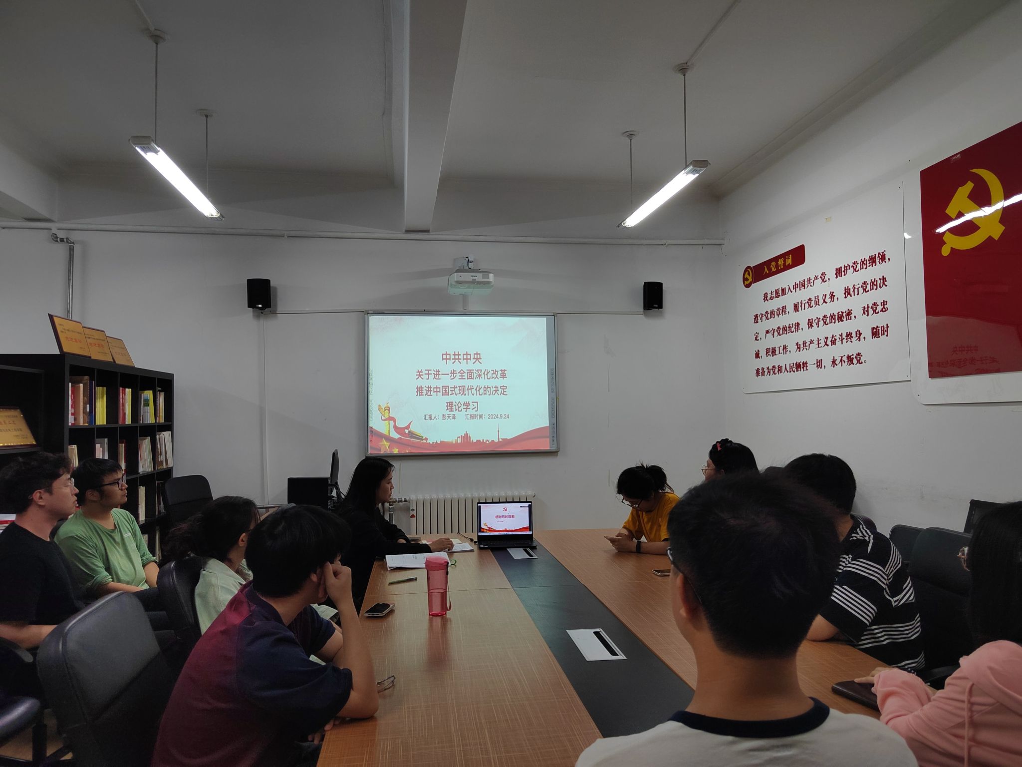为加强基层党组织建设,引导支部同志向优秀党员学习,传递榜样力量,问鼎网中国硕博原子与分子学生党支部于2024年9月24日在物理楼422会议室开展“践行初心使命,传递榜样力量”主题党日活动,本次活动邀请问鼎网中国优秀党员彭天泽同志带领支部成员深入学习党的二十届三中全会精神。党支部书记周佳佳同志主持本次活动,支部全体党员及团员参会。