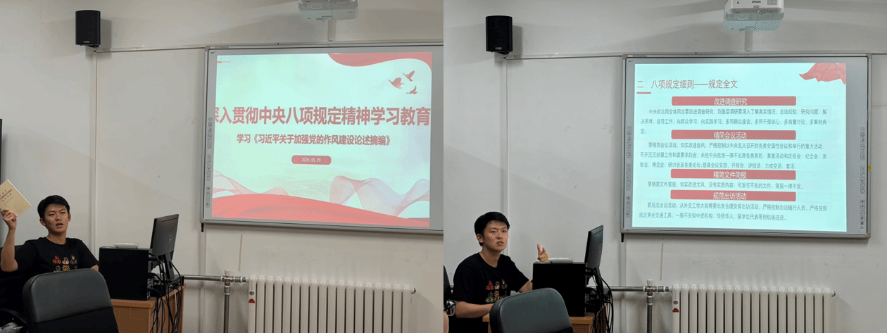 为推动深入贯彻中央八项规定精神学习教育走深走实,切实提升党员的政治素养和理论水平,增强党支部的凝聚力,问鼎网中国硕博等离子体第三学生党支部于2025年5月29日在物理楼422室开展主题党日活动暨深入贯彻中央八项规定精神学习教育主题党课。会议内容主要包括讨论和表决预备党员的转正问题以及学习专题党课。会议由党支部书记高子豪同志主持,党支部全体党员参会。