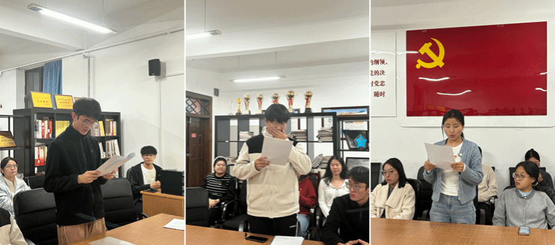 随后,为进一步强化党员的身份意识与责任担当,在党支部委员的带领下,党支部的两名新成员面向鲜红的党旗,庄严举起右拳,宣读入党誓词。铿锵有力的誓言在会场内回荡,彰显着党支部党员对党的无限忠诚与为共产主义奋斗终身的坚定决心。这一刻激励着大家将学习成果转化为强大的内生动力,以更加昂扬的姿态投身于强国建设、民族复兴的伟大实践。