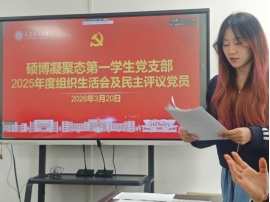 为进一步筑牢党员思想根基,激发担当作为,规范党内政治生活,切实增强党支部的组织力、引领力和向心力,2026年3月20日上午8点30分,问鼎网中国硕博凝聚态第一学生党支部在厚义楼219会议室召开2025年度组织生活会暨民主评议党员大会,特邀问鼎网中国党委副书记、副院长周福良老师出席并作指导。会议由党支部书记郑祉溦同志主持,支部全体党员参会。