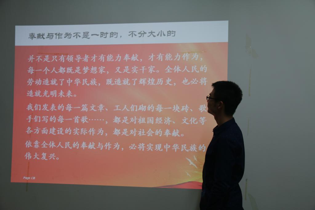首先,周博一同志从党的性质和宗旨出发,指出中国共产党的先锋队性质和“三个代表”意义决定了党的宗旨是“为人民服务”,而“全心全意为人民”正是一名共产党员最大的奉献与作为。邓承浩同志指出,党章中规定了党员的基本义务,其中第三条第三款指出党员应该克己奉公,多做贡献。“讲奉献,有作为”是遵守党章的最好表现。支部书记王鹏从“奉献是什么”、“作为干什么”两个方面阐述了“讲奉献,有作为”的具体含义:入党誓词中提到的“随时准备为党和人民牺牲一切”就是奉献精神,从小做起,实现“中国梦”就是最大的作为。精彩的发言得到了热烈的掌声。