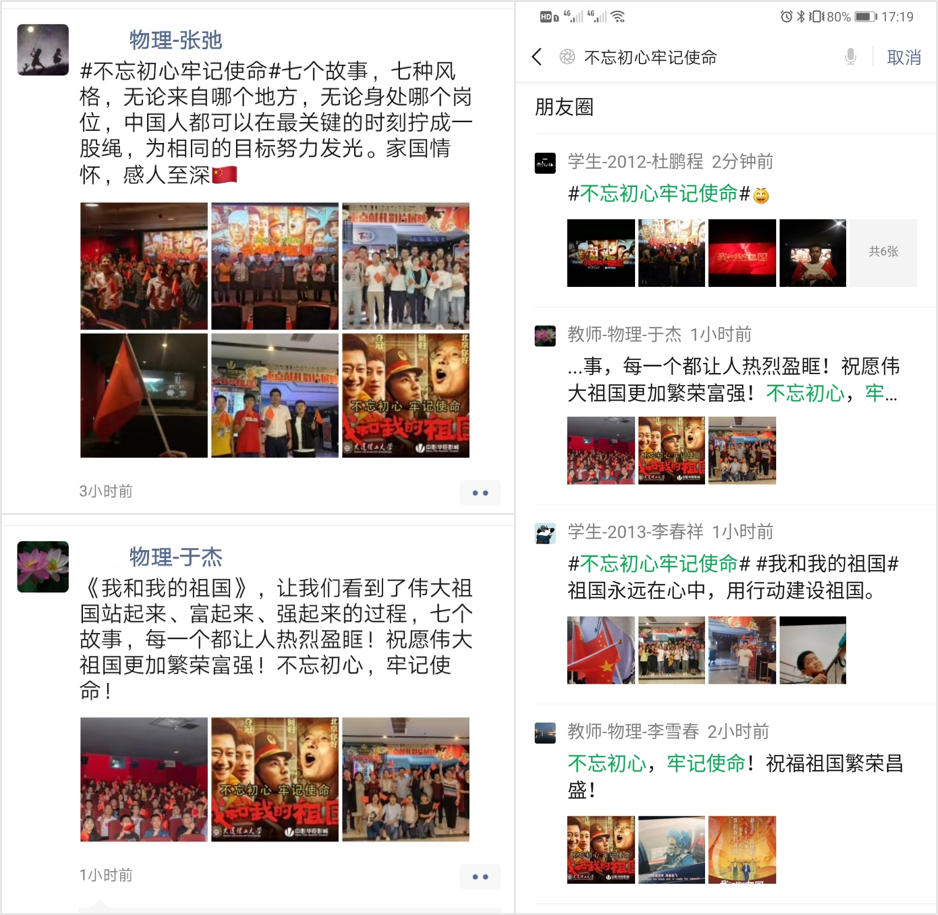 观影前后,学院各党支部纷纷合影留念,师生党员在朋友圈等处发表自己的观影感言。学院大学物理教工党支部书记于杰写到:“《我和我的祖国》,让我们看到了伟大祖国站起来、富起来、强起来的过程,七个故事,每一个都让人热烈盈眶!祝愿伟大祖国更加繁荣富强!不忘初心、牢记使命!”学院研究生党总支书记张弛说:“七个故事,七种风格,无论来自哪个地方,无论身处哪个岗位,中国人都可以在最关键的时刻拧成一股绳,为相同的目标努力发光。家国情怀,感人至深。”