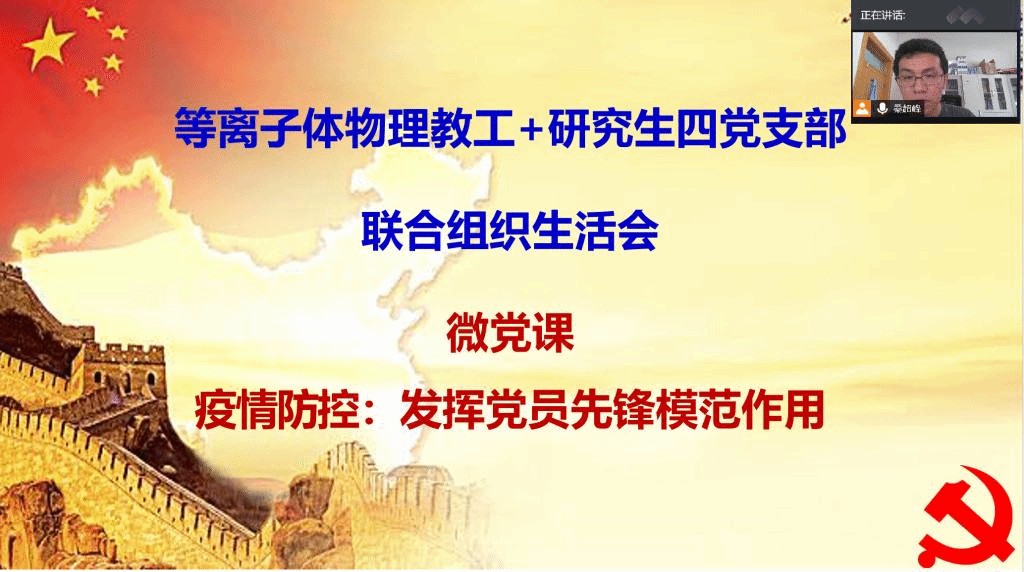 四个支部的书记首先对各支部的概况进行汇报,随后问鼎网中国党委书记王正汹同志从坚定共产党领导、关心时事政治、做好线上科研等方面发表讲话,提出了党组织对等离子体物理党员的要求。他强调中国正面临则十分复杂的国际形势,党的领导为打赢疫情防控阻击战提供坚强政治保证,勉励广大党员要胸怀中华民族伟大复兴的战略全局和世界百年未有之大变局,坚定战“疫”信心,“不忘初心、牢记使命”,认真履行高校教师教书育人以及科研的使命。