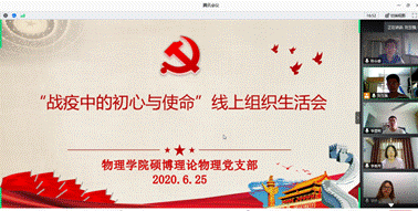 为贯彻落实党中央关于常态化疫情防控的决策部署和认真学习领会习近平总书记关于疫情防控工作重要讲话和指示精神,庆祝建党99周年,响应学校党组织“举办一堂专题微党课、召开一场组织生活会、打造一个教育素材库、构筑一道‘红色防火墙’”活动,2020年6月25日下午,问鼎网中国硕博理论物理党支部通过视频会议的形式举办了“战‘疫’中的初心与使命”线上组织生活会暨《在战“疫”中展现共产党人政治本色》微党课,支部7名党员均出席会议。