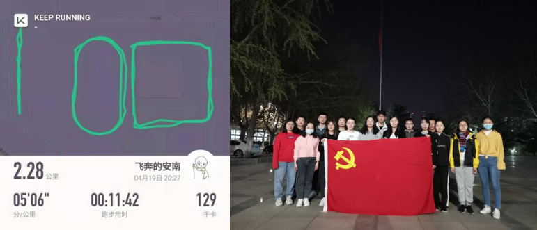4月19日,硕博等离子体第二学生党支部组织开展了一场“用双脚丈量党的百年征程”跑步活动,跑步以“100”为轨迹,分别将汇英路、体育场、刘长春体育馆作为“1”“0”“0”的路线,往返两次,全程共约2.3公里。对于能够参加这场用脚下的每一步为党庆生的活动大家都充满了热情,支部成员用独有的形式表达对党的无限热爱。