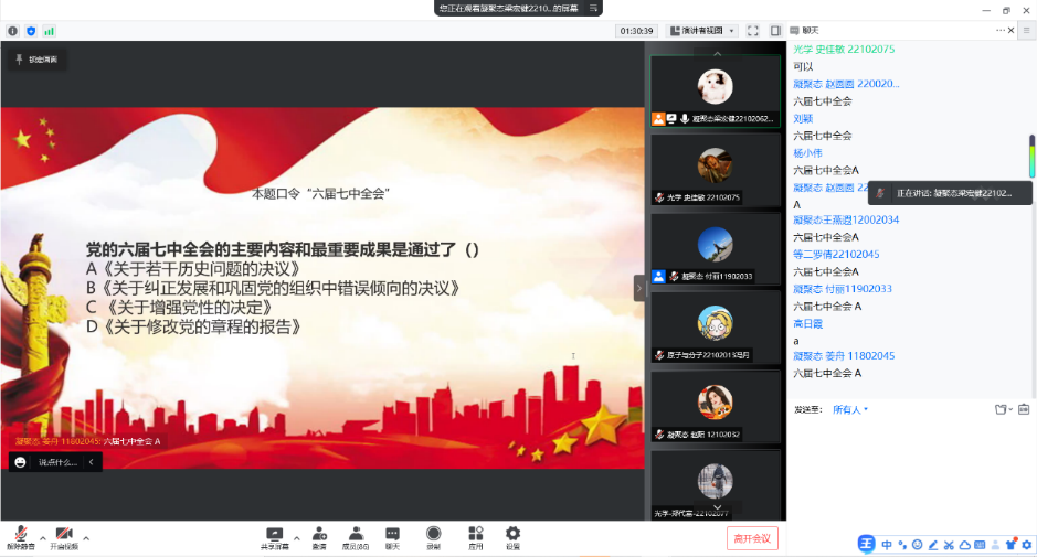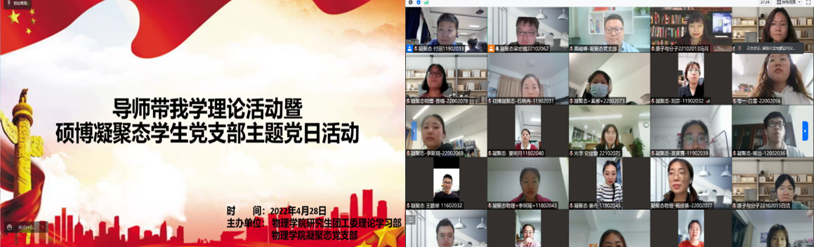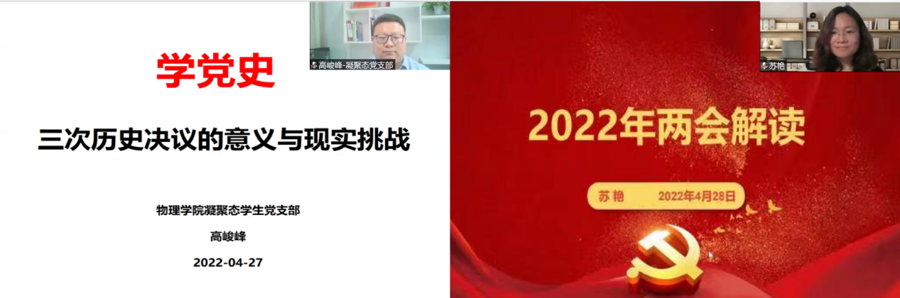 在这个特殊节点,问鼎网中国硕博凝聚态学生党支部协同问鼎网中国研究生团工委于4月28日晚顺利开展主题党日暨导师带我学理论活动。本次活动特邀请中白学院副院长高峻峰老师、问鼎网中国凝聚态与理论物理教工党支部书记苏艳老师带领大家回顾我党历史上三次历史决议,领会两会精神。激励同学们走好全面建设社会主义现代化国家新的赶考之路,以实际行动迎接党的二十大胜利召开。本次党日活动受到学院老师同学积极响应,超过八十人参与本次活动,凝聚态支部全体党员参与活动。