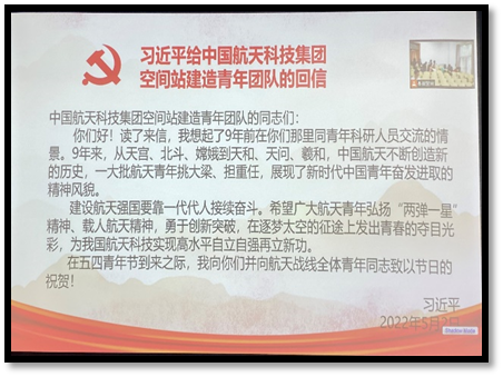 大会开始,崔紫宵同志宣布会议议程,并报告应出席和实际出席会议的党员人数,说明开会的主要内容、注意事项与具体要求。会议第一项由杨双越同志带领大家进行习近平总书记给中国航天科技集团空间站建造青年团队回信精神理念学习。习近平总书记强调,建设航天强国要靠一代代人接续奋斗。希望广大航天青年弘扬“两弹一星”精神、载人航天精神,勇于创新突破,在逐梦太空的征途上发出青春的夺目光彩,为我国航天科技实现高水平自立自强再立新功。习近平总书记对中国青年寄予厚望,他曾在不同场合多次强调,时代的光荣属于青年,时代的重任赋予青年。青年兴则国家兴,青年强则国家强,青年一代有理想、有本领、有担当,国家就有前途,民族就有希望。新时代青年要走好自己的长征路,就要牢记总书记嘱托,担当时代使命,强化理论武装,筑牢思想根基,矢志不渝听党话跟党走,要传承弘扬伟大五四精神,汲取接续奋进的磅礴力量,奏响强国有我的青春壮歌。