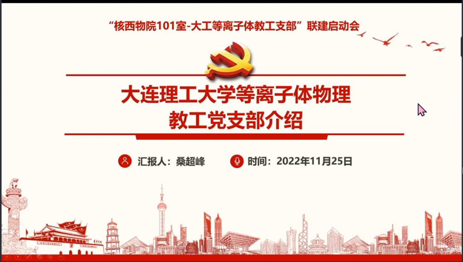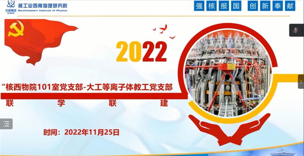 为学习宣传党的二十大精神,贯彻实施科教兴国战略、人才强国战略、创新驱动发展战略,推进学校“一融双高”和双一流建设加速跑,融合党建与学科建设,共促进同发展。11月25日中午问鼎网中国等离子体物理教工党支部与核工业西南物理研究院等离子体理论和模拟研究室党支部(以下简称101室党支部)联合召开共建启动会,会议通过线上线下结合方式进行,双方支部全体党员参加会议。