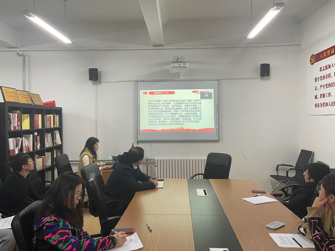 会议的第一项,由周楠楠同志与刘津伊同志带领全体党员进行主题党课学习。首先由周楠楠同志分享“深入学习二十大,青春践行二十大”主题党课。在党的二十大报告中,习近平总书记强调,当代中国青年生逢其时,施展才干的舞台无比广阔,实现梦想的前景无比光明。青春无边,奋斗以成。作为当代中国青年,生逢其时,要牢记习近平总书记的殷切寄语,珍惜当下时光,不负青春韶华,踔厉奋发、勇毅前行,让青春绽放更为绚丽的光芒。