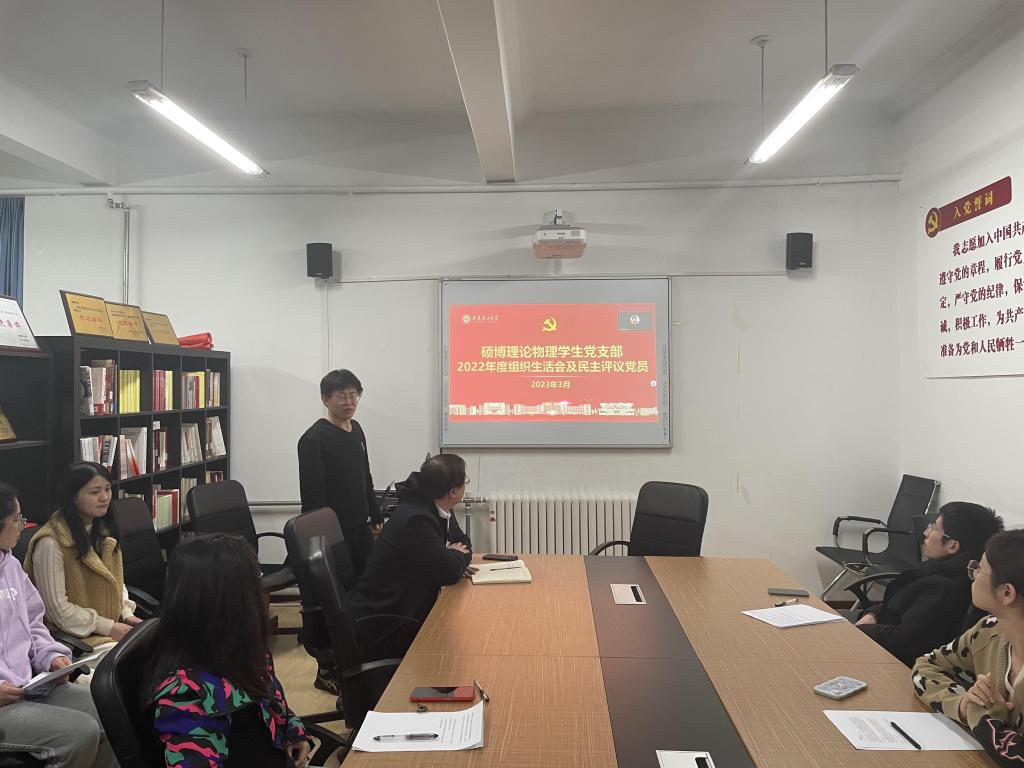 根据学校党委《关于召开2022年度基层党组织组织生活会和开展民主评议党员的通知》和学院党委的部署安排,支委会为更好开展组织生活会和民主评议党员相关工作进行精心准备,会前,支部围绕《学习党的二十大精神,正确理解中国式现代化》的主题党课教育,为开展好组织生活打下思想基础。硕博理论物理学生党支部2022年度组织生活会和民主评议党员于2023年3月2日晚7点在422会议室采取线上与线下相结合的方式进行开展。本次会议的主要内容有两部分,党课集中学习与组织生活会和民主评议党员。其中,集中学习围绕深入贯彻党的二十大精神和毛泽东同志“向雷锋同志学习”题词发表六十周年来开展。本次会议由支部书记刘玉强同志主持,问鼎网中国副院长于长水同志出席会议,支部全体党员参加。