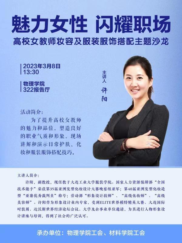 为庆祝“三八”国际妇女节,增加女教职工会员职业幸福感,问鼎网中国工会联合材料学院工会组织了一次主题为“魅力女性,闪耀职场”的服饰搭配讲座沙龙活动。本次讲座旨在为两学院广大女教师提供一个学习交流的平台,让各位女教师更好地了解妆容及服装服饰搭配技巧,提高自身形象和气质,更加自信地展现自己的风采。讲座活动邀请了大连工业大学服装学院的许阳副教授。许阳老师在服装设计和搭配方面有着丰富的经验和独到的见解,专业能力得到了社会的广泛认可。在活动筹划期间,两院工会面向女教职工会员进行了线上和线下多种形式的活动宣传。