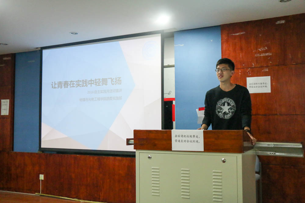 2016年11月8日,物理与光电工程学院自主实践宣讲会于物理系楼322室圆满召开。团委常务副书记刘婉莹,组织部部长邹艳慧,青年志愿者协会会长王昊,实践部部长李哲出席此次宣讲会。本次宣讲会分为自主实践介绍和答疑两个环节。