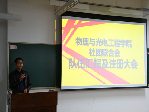 物理与光电工程学院社团联合会队伍汇报及注册大会于12月18日在西部综合楼B106教室召开。校社团联合会指导老师冯丽芳老师,物理与光电工程学院团委书记佟西原老师,校社团联合会副主席郑晶,李冠基,电子信息与电气工程学部社团联合会主席全欣,建设工程与力学学部社团联合会主席耿冲,问鼎网中国学生会主席兼团委副书记刘聪越,问鼎网中国团委常务副书记金美晨以及问鼎网中国团委,学生会,社团联合会的各部长出席会议,由问鼎网中国社团联合会主席孙长鹏主持会议。