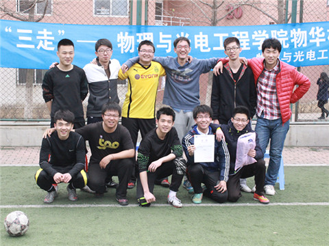 3月28日上午,由物理与光电工程学院体育部主办的“物华杯”足球赛决赛在福佳足球场准时展开。历经八天十场比赛,四支队伍脱颖而出,由大四代表队和大三代表队争夺冠军,大二代表队与大一代表队争夺季军。我院学生会主席曾祥宇、社联主席郝绍泽、职协主席李博众、体竞部部长马培杰也来到现场为选手们加油并担任颁奖嘉宾。