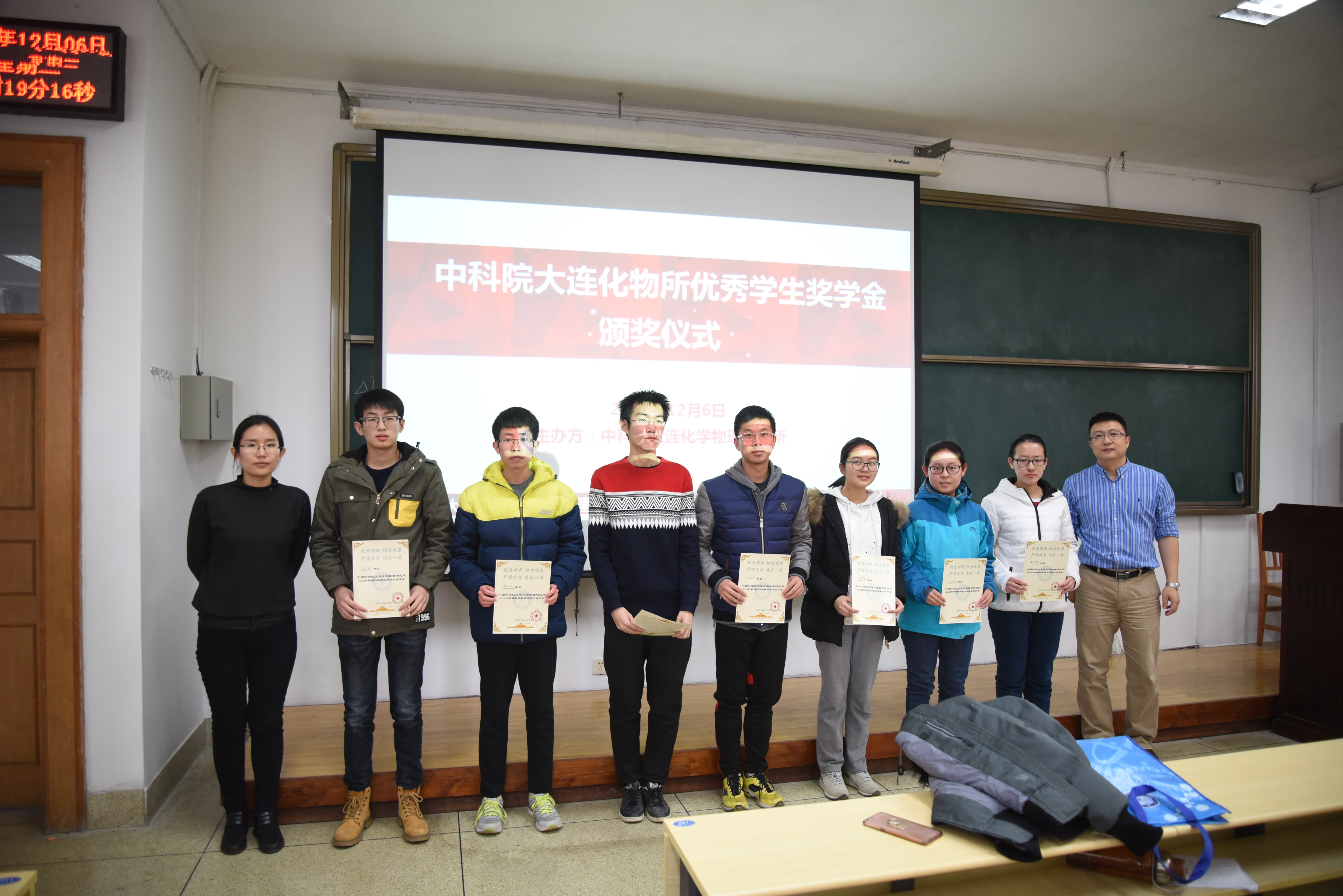 活动开始,主持人佟西原简单地介绍了到场嘉宾以及大连化物所奖学金的相关内容,并宣布获奖学生名单。在一片热烈的掌声中,获奖学生上台领奖,大连化物所的于老师和熊老师依次为获奖的14级、15级、16级优秀学生颁发获奖证书,并对获奖学生表达鼓励;获奖学生也纷纷对两位老师表示感谢,也表示今后会再接再厉。颁奖环节结束,两位老师与获奖学生合影留念。
