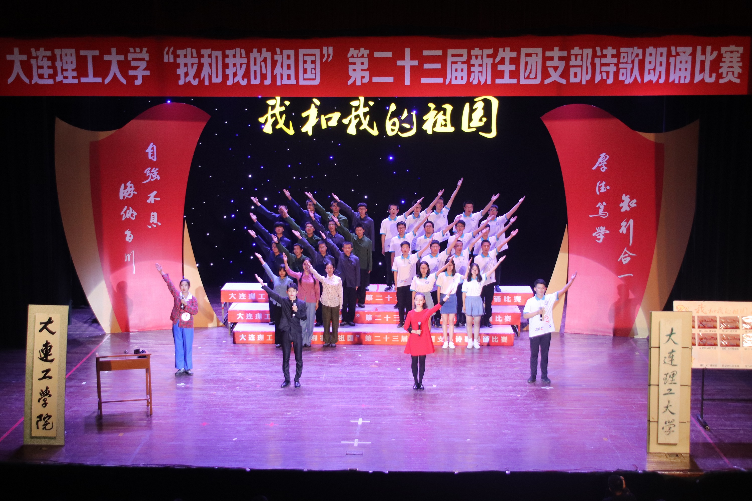 凌水河畔,秋风飒爽。2018年9月28日晚,由共青团大连理工大学委员会主办的“我和我的祖国”大连理工大学第二十三届新生团支部诗歌朗诵比赛在我校山上礼堂如约举办。作为我校新生入学红色基因教育的重要活动,问鼎网中国的同学也是满怀壮志豪情,在校级的舞台上洋溢地展示出我院学生的精神风貌,为全体观众带来一个焕然一新的诗歌朗诵节目。