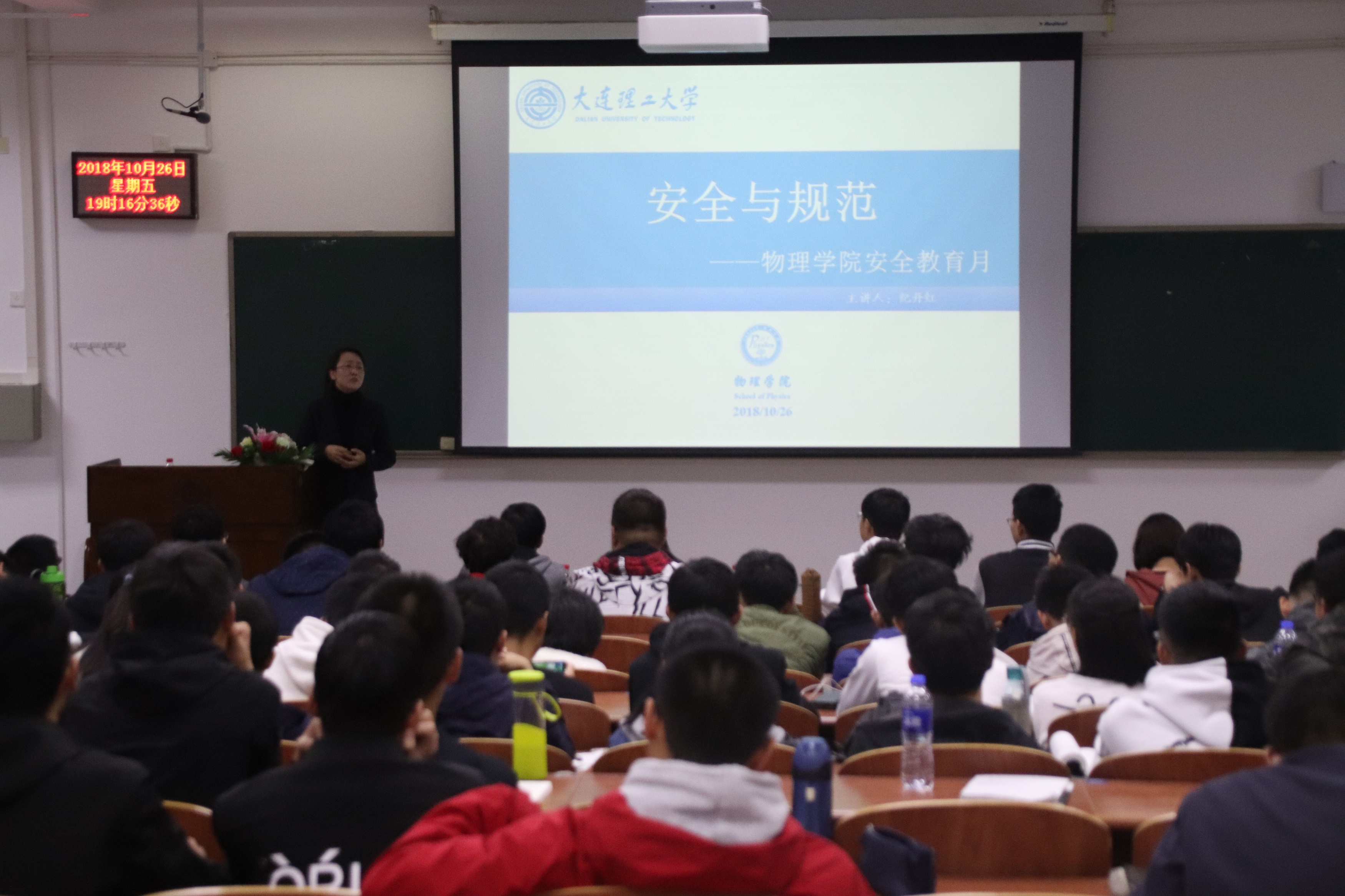 讲座中,纪丹红首先点出校园生活中许多的安全隐患,比如在寝室中使用大功率电器会引发火灾,以及离大学生们很近的食品安全问题。如果学生疏忽,极易引起严重的后果。因此她认为,学校安全排查具有重要性。学校的安全排查可以弥补学生因为缺乏完整的安全知识而产生的安全漏洞,可以扫除学生生活的安全盲点,是保证校园安全的有效措施。讲座中,她特意强调,寝室用电安全是校园安全的重中之重,纪丹红以当年她读本科生时发生在大工校园女生寝室里的真实案例,再次强调寝室违规使用电器的巨大危害。学校将卷发棒、热水壶、吹风筒等大功率电器列为寝室禁用电器,是有道理的。最后她指明,规范是安全的第一前提,接下来“安全教育月”的主要内容就是规范物理学子的安全行为。