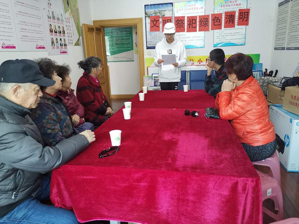 4月5日,清明节之际,实践小组成员李天铭在与白山路街道中山路社区提前沟通后,在中山路社区进行文明祭祀的倡导和宣讲。宣讲内容主要是倡导文明祭扫新风,做到低碳祭扫、安全祭扫、节俭祭扫;倡导绿色出行,合理安排祭扫时间,提倡乘坐公共交通出行,减少车辆拥堵;倡导移风易俗,推进丧葬礼俗改革,崇尚科学,不搞迷信活动,文明祭奠;倡导党员干部作表率,积极落实中央八项规定精神和党员干部带头推动殡葬改革的要求,努力在生态安葬、节俭治丧、文明祭扫等方面作表率,以实际行动影响和带动身边群众。此次宣讲活动结合实际情况,体现了绿色发展新理念。