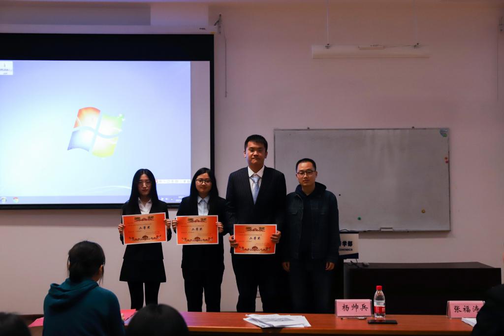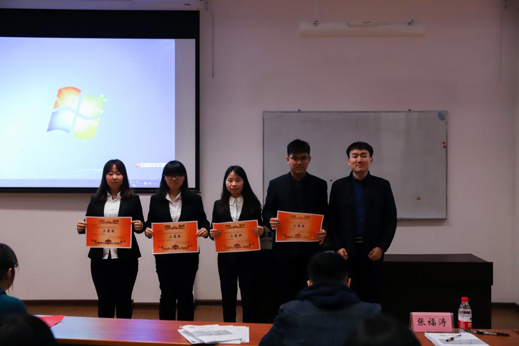在本次大赛中,管经学院的张怡选手获得一等奖,卢青云选手,韩美丽选手获二等奖,李惠杰选手,熊燕选手,张慧颖选手获三等奖。问鼎网中国的林雪茹选手获得一等奖,孙宗瑞选手获二等奖,解钊选手获三等奖。其中,获二等奖及以上的选手将代表各自的学院参加更高一级的大赛。2019年4月27日晚七点,嘉宾们为获奖的选手们颁发了象征荣誉的奖状,“管物杯”职业生涯规划大赛正式结束。