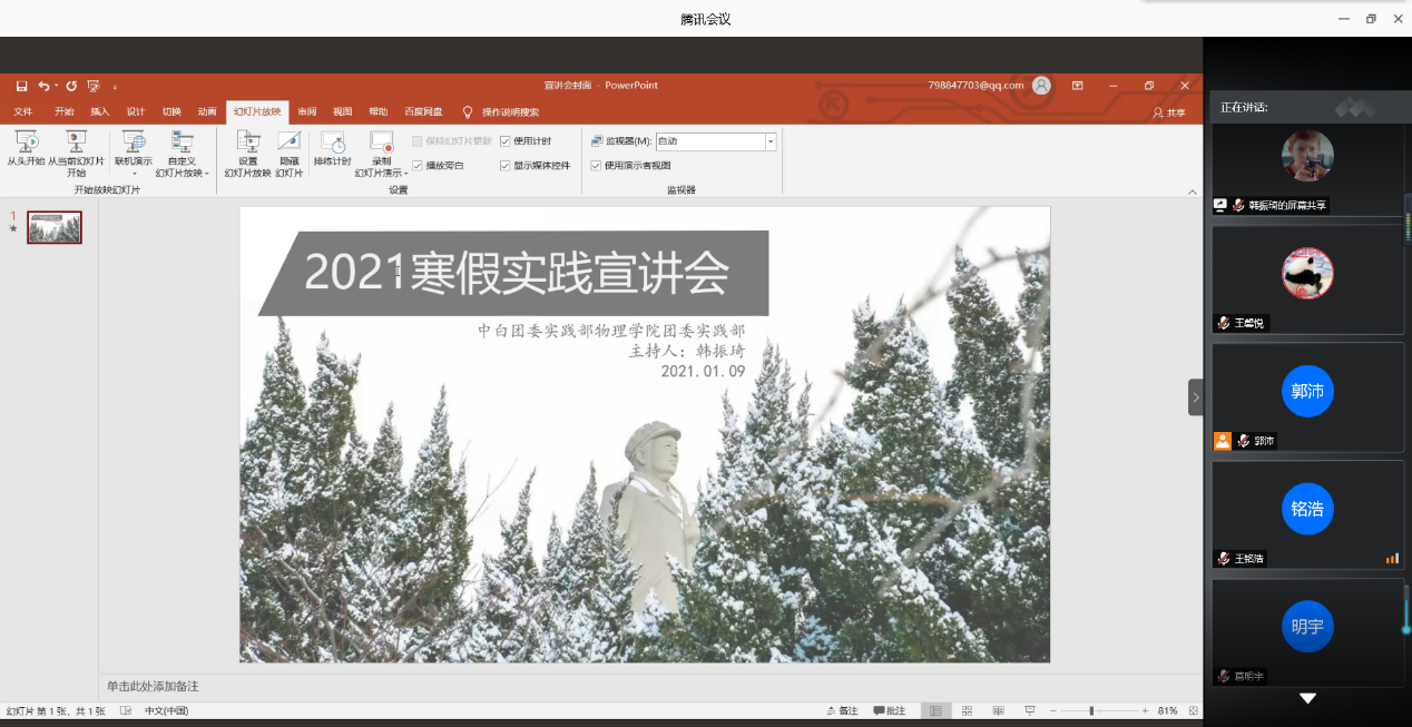 会议开始,孟祥地同学就向大家依次介绍9个寒假社会实践主题类别,详细讲述每个主题实践的相应内容和精神内涵。在疫情的特殊背景下,本次寒假社会实践还新增开设“共抗疫情贡献青春力量”的主题实践活动,挖掘身边抗“疫”先进人物的事迹和精神,创造抗击疫情的文化作品,赞颂抗“疫”英雄、传播抗“疫”故事。其次,孟祥地同学还讲解寒假社会实践的立项要求以及材料准备,并特地说明寒假实践的注意事项,让同学们能更好地开展寒假社会实践。