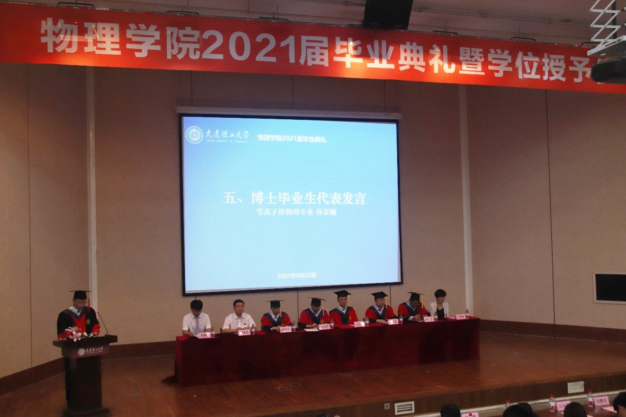接下来是研究生毕业生代表孙景毓的发言。孙景毓同学回顾五年的直博生涯,并与大家分享其导师王友年教授的一句话“不要总想着一铁锹就挖出个金子”,鼓励着他静下心来,用知识一点一滴的沉淀、在科研上一脚一步的探索,最终才能到达成功的彼岸。