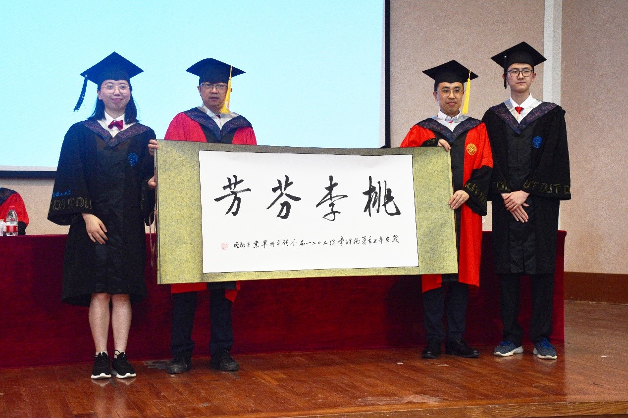 在分别之际,学院给毕业学子们准备了礼物,而毕业生们也向学院赠送一幅由一名毕业生书写的书法作品—《桃李芬芳》。它代表全体毕业生对学院老师辛勤栽培的感恩之情,师恩重如山,他们定不会忘记这浓浓的师恩。