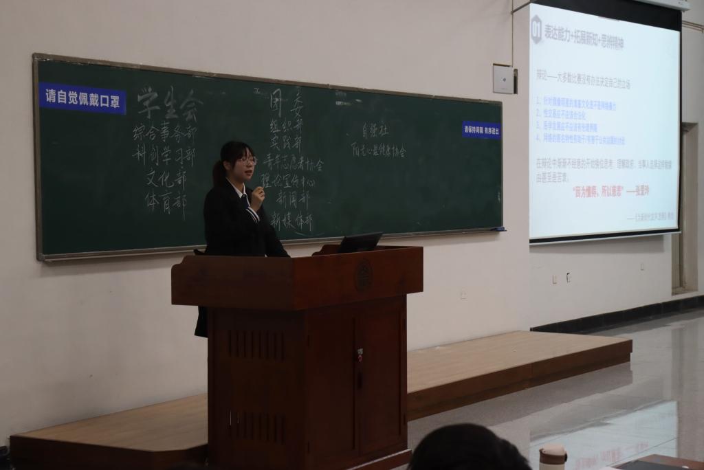 接下来,综合事务部、科创学习部、文化部、体育部等各部门负责人依次走上讲台展示工作成果、介绍部门部门职能与福利。文化部的糖果、理论宣传中心的照片、实践部的视频等各部门手段齐出,全场掌声不断。结束前,问鼎网中国辩论队也走上讲台向广大新生发出诚挚的邀请。
